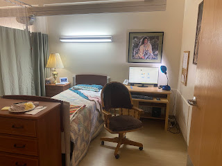 So she is now in what used to be an office. It’s a bit smaller than the space she had before, it has no closet, and the bathroom is a public one directly across the hall from her. But, and most importantly, she loves it. We again have made it as homey and comfortable as possible (she has her pictures hung - just didn't get a picture of it) and she constantly fusses with things: rearranging and moving things around.